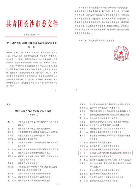 近日,共青团长沙市委下发《关于命名表彰2023年度长沙市青年岗位能手的决定》(长团发〔2024〕4号)文件,长沙市第三医院药学部主管药师邓阳荣获“2023年度长沙市青年岗位能手”荣誉称号。