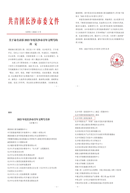 近日,共青团长沙市委下发《关于命名表彰2023年度长沙市青年文明号的决定》(长团发〔2024〕3号)文件,长沙市第三医院皮肤科荣获“2023年度长沙市青年文明号”荣誉称号。