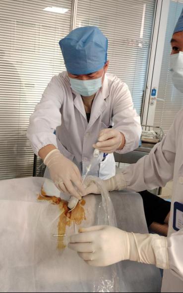 在超声的精准引导下,微创操作有条不紊地进行着,医护人员凭借着精湛的技术和默契的配合,成功为谭奶奶完成了“肾造瘘术”。