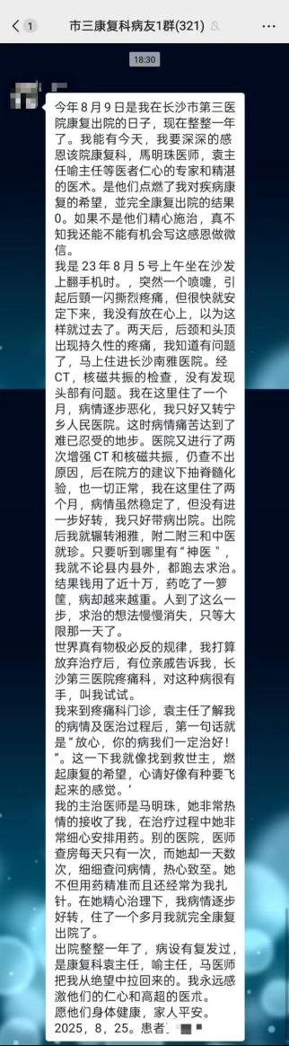 “出院整整一年了,病没有复发过,是康复科袁主任、喻主任、马医师把我从绝望中拉回来。我永远感激他们的仁心和高超的医术!”疾病再未复发过的张爷爷特意在出院一年之际,在病友群里逐字逐句写下对康复医学科的感谢之情。