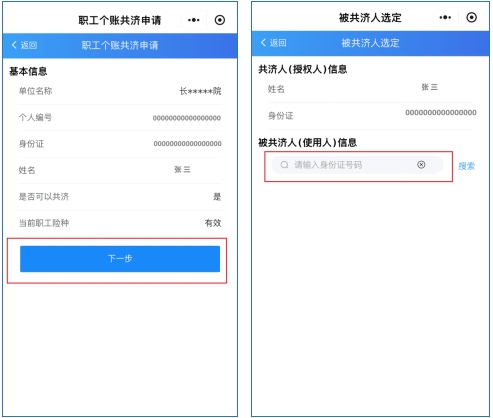 2、进入“职工个账共济申请”页面后,可以查看到职工的个人信息,确定为可以共济的账户后点击【下一步】,进入“被共济人选定”页面,输入家庭成员身份信息完成共济对象的捆绑。