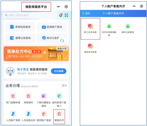 1、通过“湘医保”APP或微信小程序等,在【业务办理】栏目点击【家庭共济】,进入“个人账户家庭共济”功能模块后,选择【职工共济申请】;
