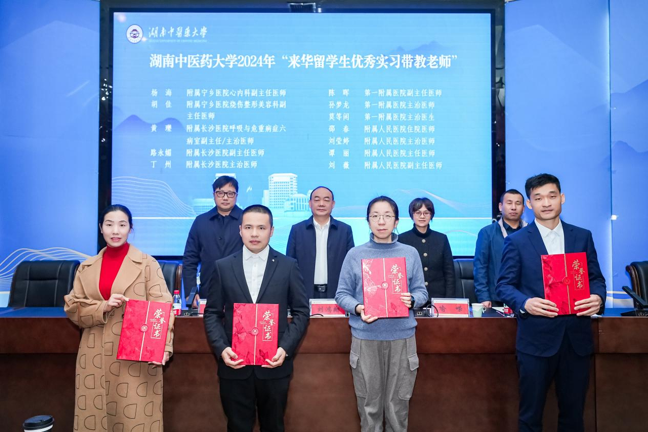 在1月16日举行的湖南中医药大学来华留学生临床教学工作会议上,长沙市第三医院接受授牌,成为湖南中医药大学来华留学生临床教学基地,科教部副主任邓阳获评成为湖南中医药大学2024年“来华留学生优秀实习管理工作者”;呼吸与危重症医学科六病室副主任黄瓅、消化内科副主任医师路永媚、骨科二十一病室主治医师丁州被评为湖南中医药大学2024年“来华留学生优秀实习带教老师”。