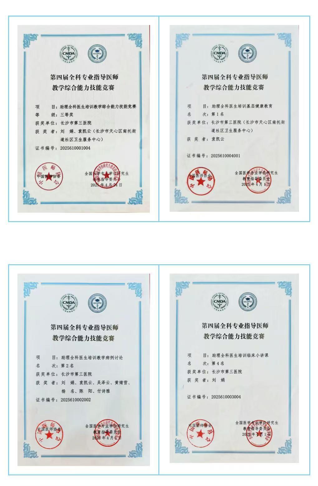 长沙市第三医院(湖南大学附属长沙医院)全科医学科主治医师刘娟与医院助理全科医生培训基层实践基地——长沙市天心区南托街道社区卫生服务中心主治医师袁凯云携手,带领的助理全科培训学员参赛队荣获中国医师协会第四届全科专业指导医师教学综合能力技能竞赛助理组团体奖三等奖,并取得助理全科医生培训基地基层健康教育全国第一名、教学病例讨论全国第二名,临床小讲课全国第四名的好成绩。