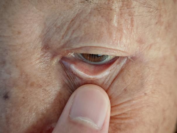 ▲患者下眼睑内膜呈苍白色