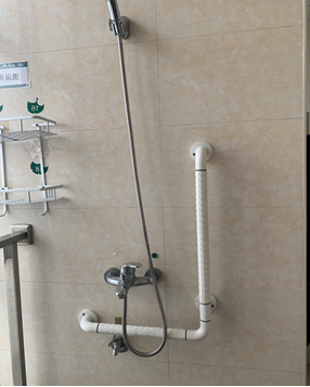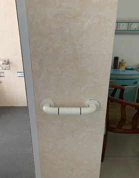 ▲淋浴处增设扶手,“L”型设计,同时满足坐、站立两种淋浴方式,老年人洗澡时可撑扶,更省力。