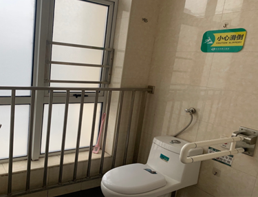 ▲马桶旁增设可折叠扶手,取放自由、使用更方便,老年人起坐时可借力,更安全。