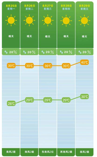 根据长沙市气象台发布的天气预报,接下来的一周,长沙主打一个“热晴四射”,29日最高气温将冲至40℃。