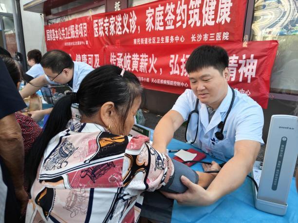 近日,天心区沿江村的活动广场上热闹非凡,来自长沙市第三医院(湖南大学附属长沙医院)的专家团队与天心区南托街道社区卫生服务中心的医务人员一道,带着听诊器、血压计、血糖仪和中药理疗包,为当地居民送上一场“零距离”的优质健康服务。